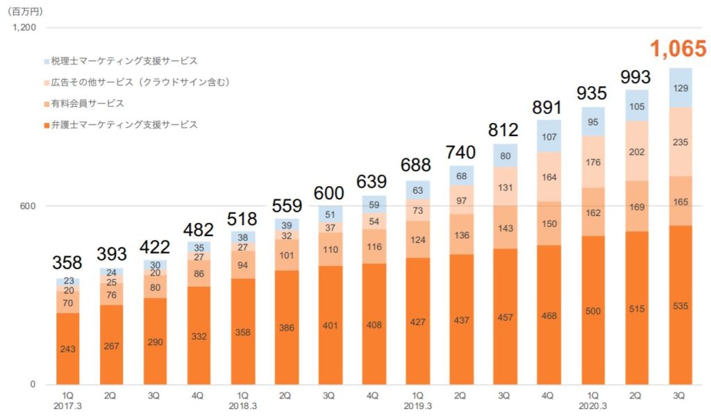 2020年3月期第3四半期では、税理士マーケティング支援サービスおよび広告その他サービスにおけるクラウドサインが牽引。有料会員サービスは、検索経由によるサイト訪問者数の減少により有料会員数が減少し、前四半期比減収クライドサインへの投資を積極的に行っている年に。