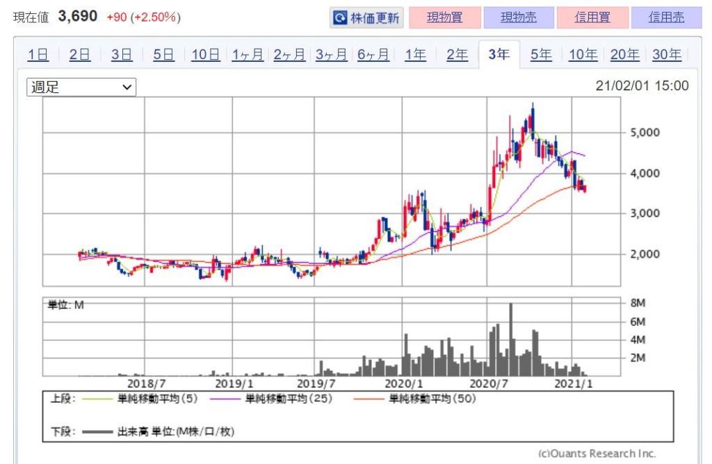 freee社の株価は、上場後、コロナ禍を得ても大きく右肩上がりで上昇しています。SaaS関連やDX関連でもある為注目を個人投資家から浴びています。