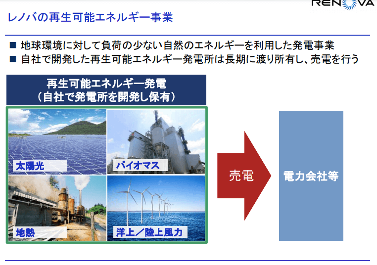 これは自社で開発した再生可能エネルギー発電を売電するビジネスです。再生可能エネルギーは固定価格買取制度によって、買取単価が決まっているので、一度発電所を作ってしまえば、安定した収益が期待できます。